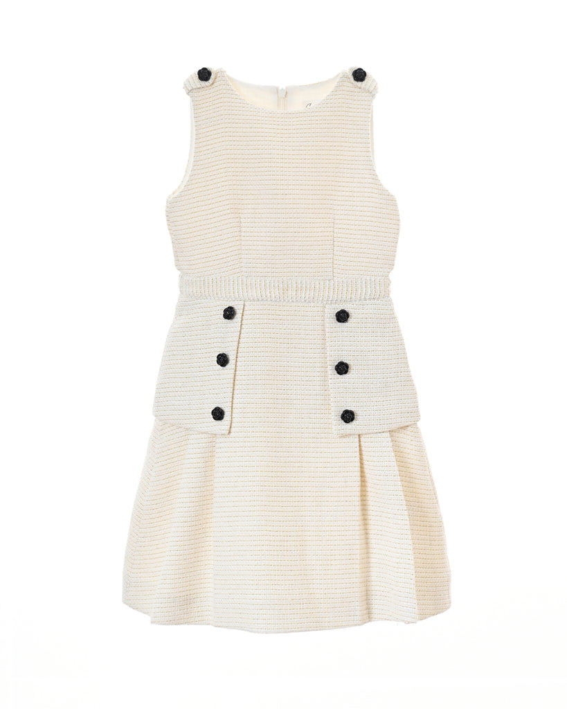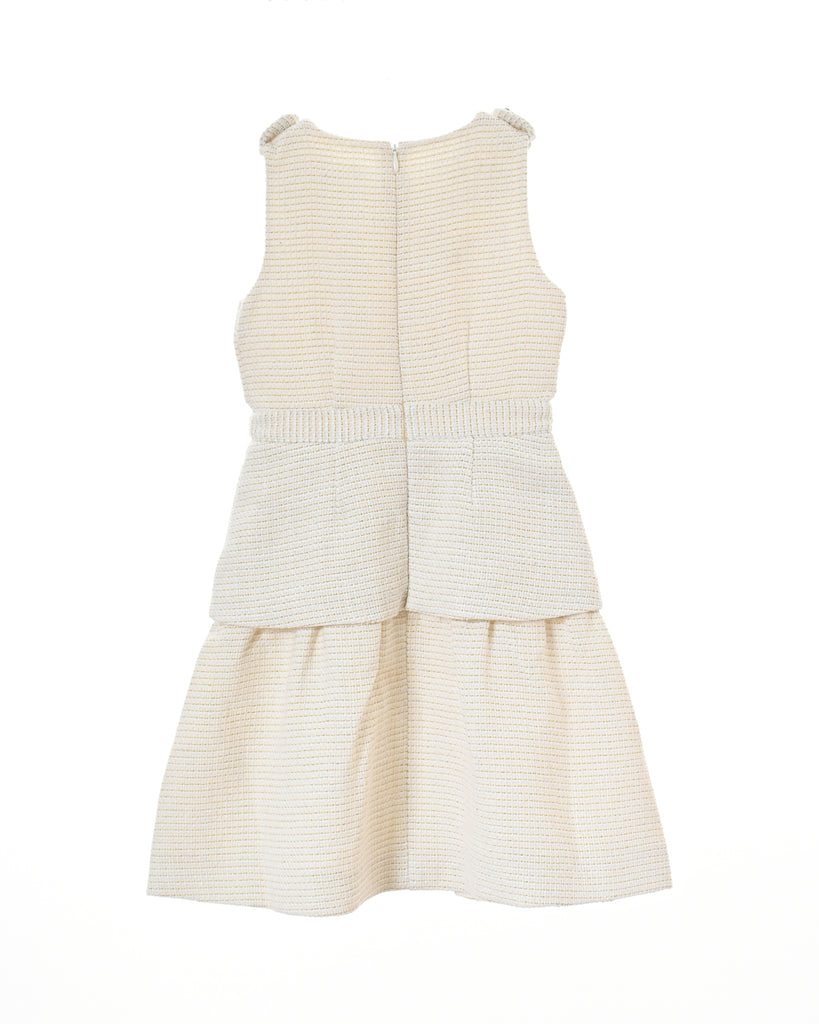 The Daphne sleeveless dress comes in two different colors (ivory with gold metallic thread, black with gold metallic thread), features a peplum design skirt with Camellia buttons on the shoulder and front skirt. Fully lined with invisible zipper on the back.